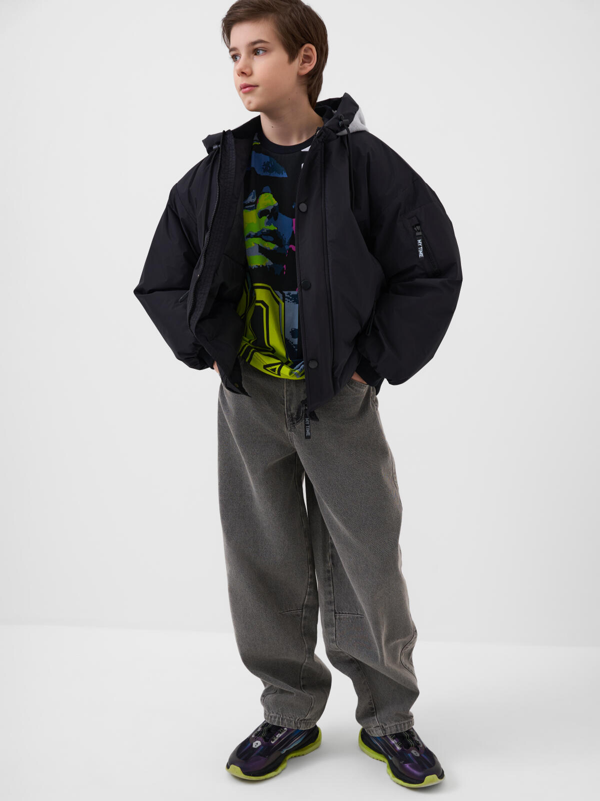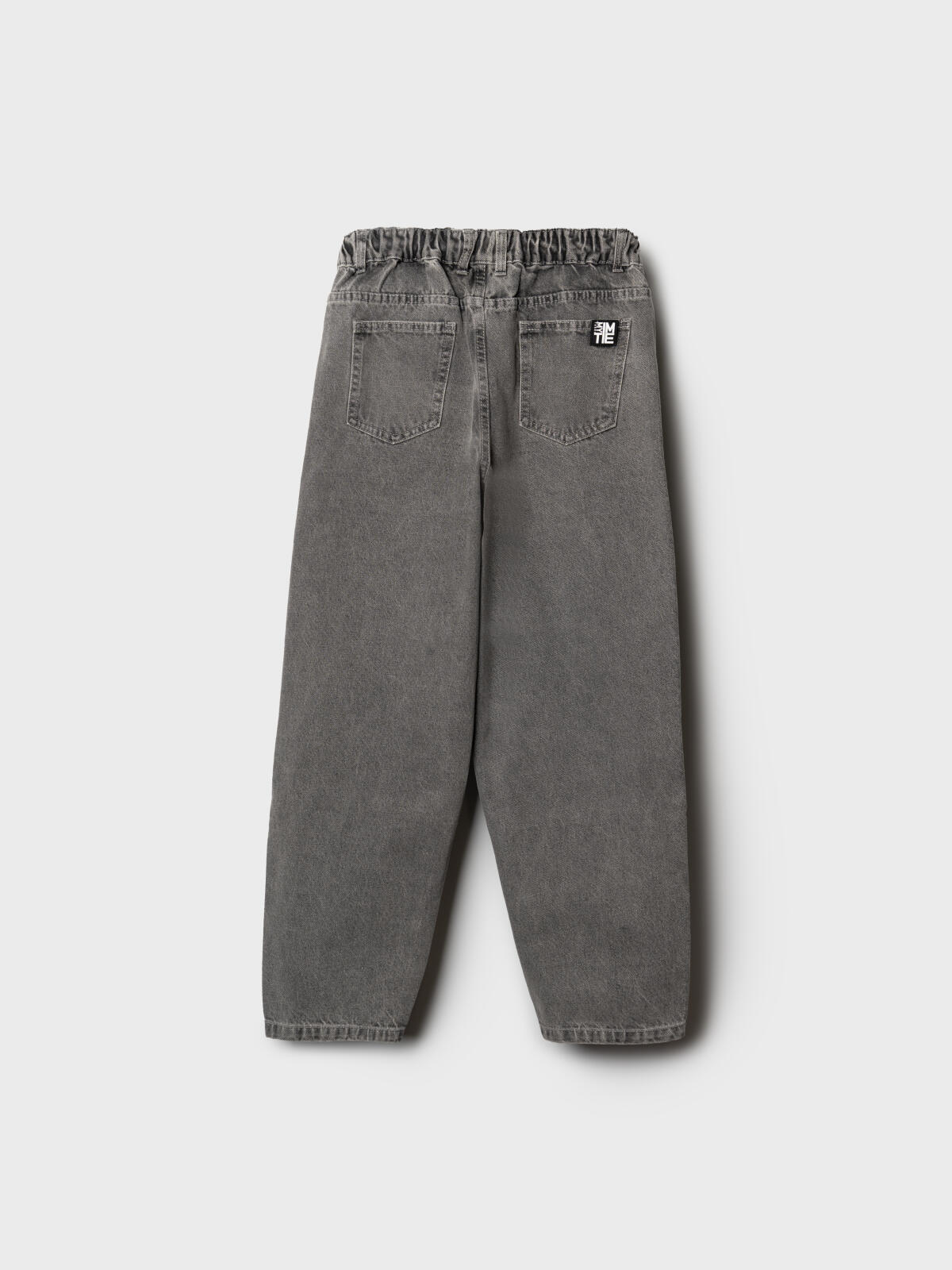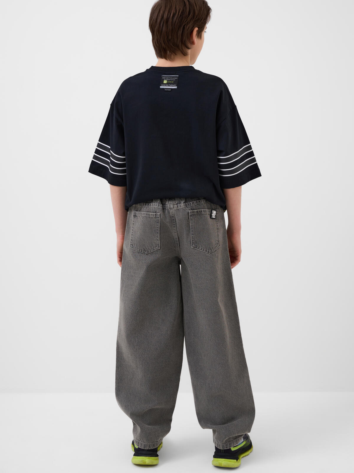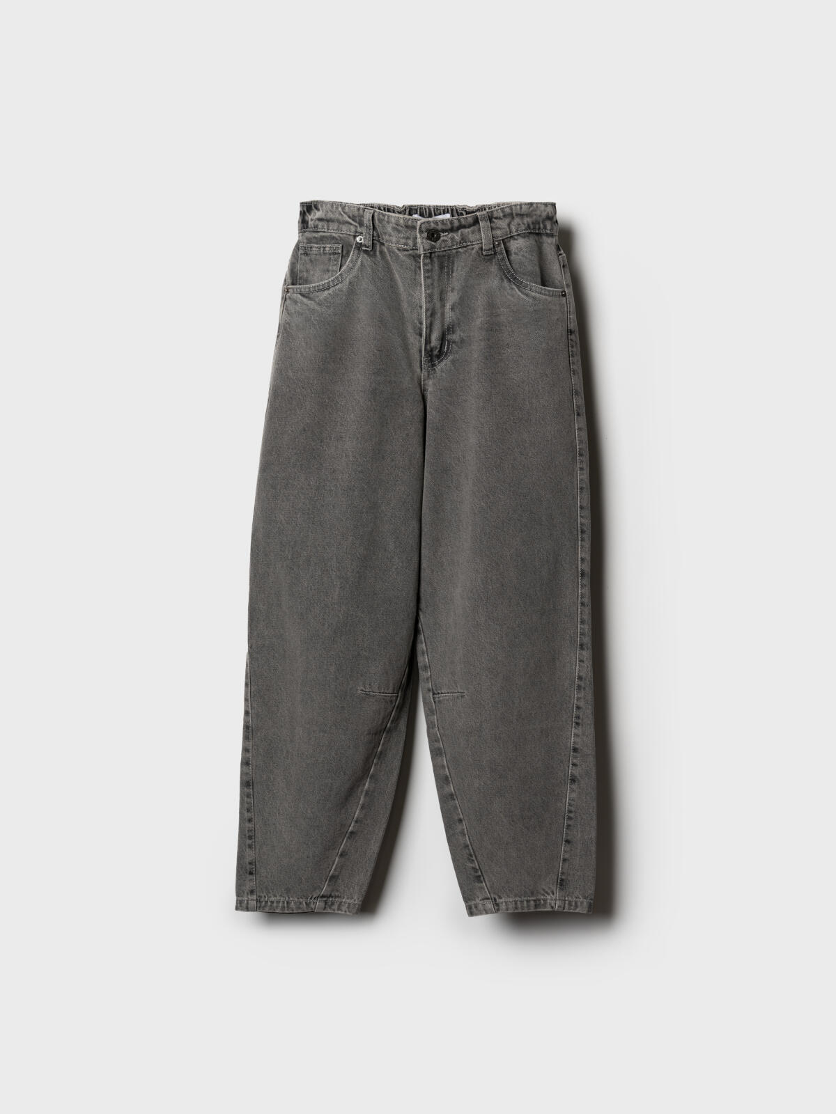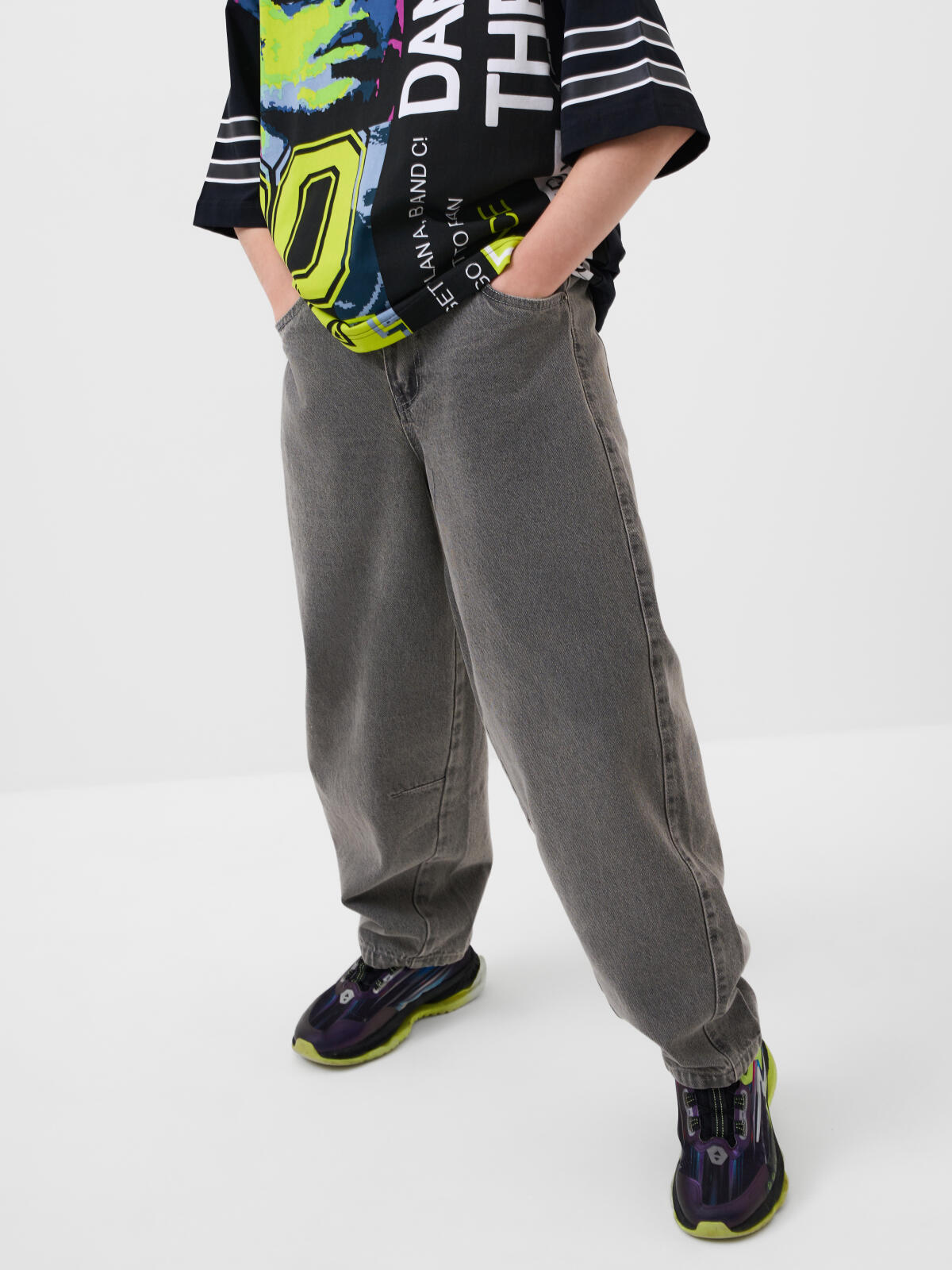 Джинсы багги для мальчика подростка. Модель прямого силуэта, свободной посадки со слегка укороченной длиной. Сзади пояс собран на резинку, что обеспечивает комфортную посадку. Джинсы выполнены из плотного светло-серого денима. Спереди расположены два классических кармана, сзади – два накладных кармана. Застежка на молнии и кнопку. На заднем кармане — декоративная нашивка с логотипом.